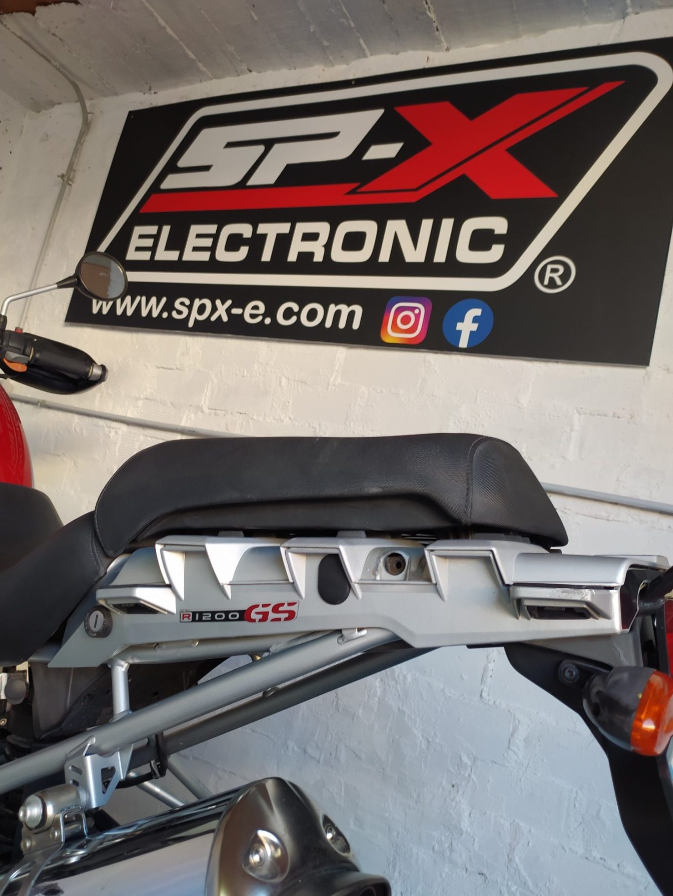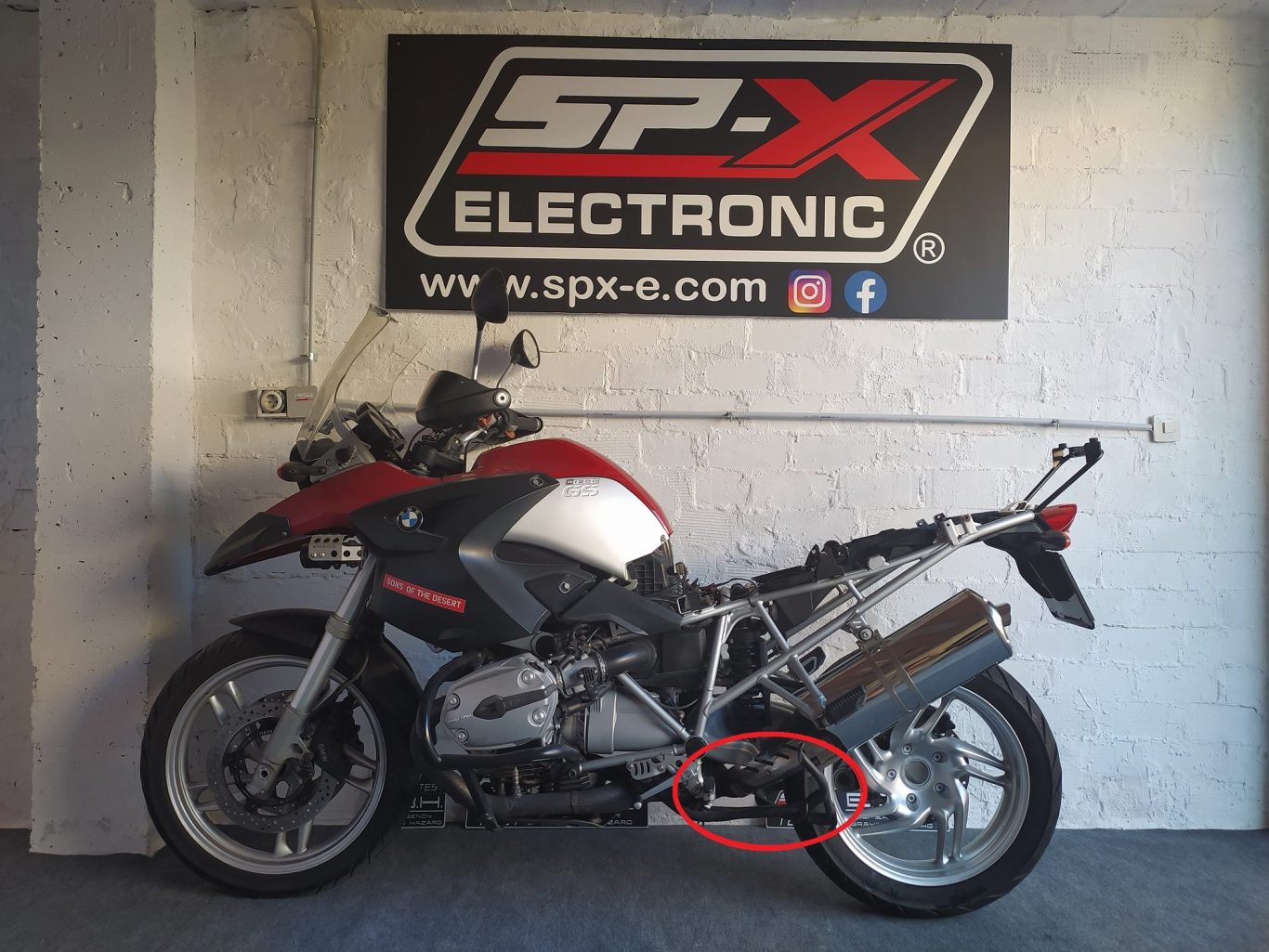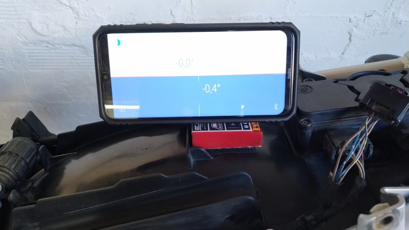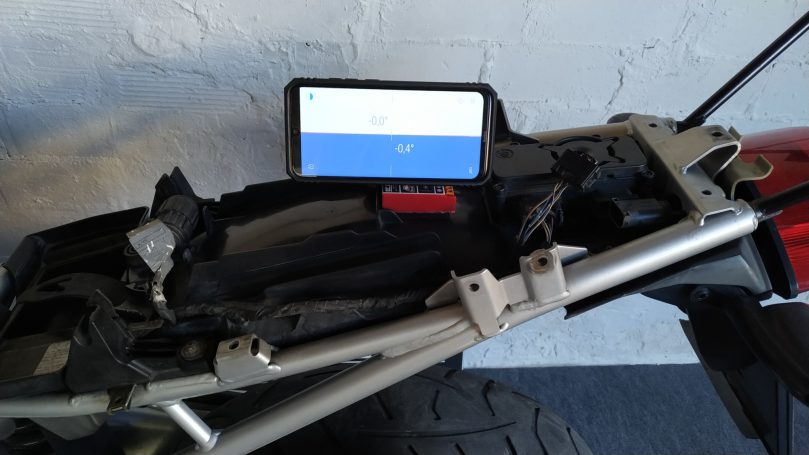 Para este caso de BMW realizamos la nivelación con sus dos ruedas en el suelo y la moto soportada en el muro (como se indica en la foto).