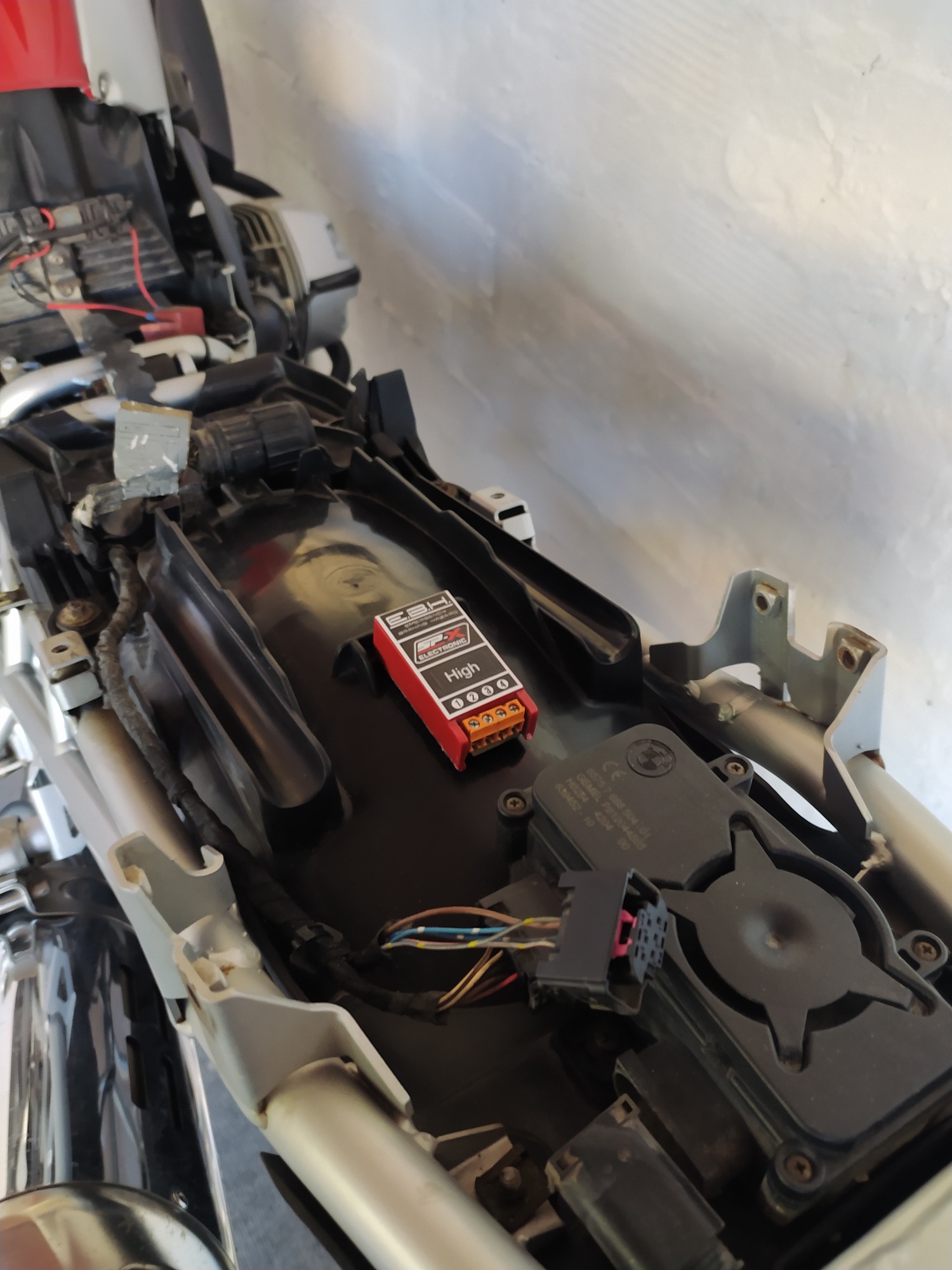 Conectar el módulo a la moto por medio de los cables y roba corriente (suministrado). Consulte el manual de instrucciones y el botón de nuestra web(Código Cables Motos) para su correcta conexión. No realice este trabajo con el vehículo en contacto.